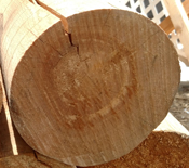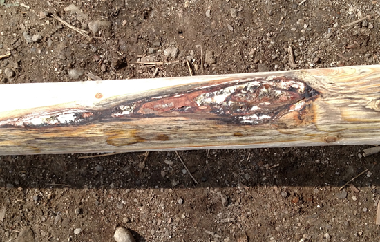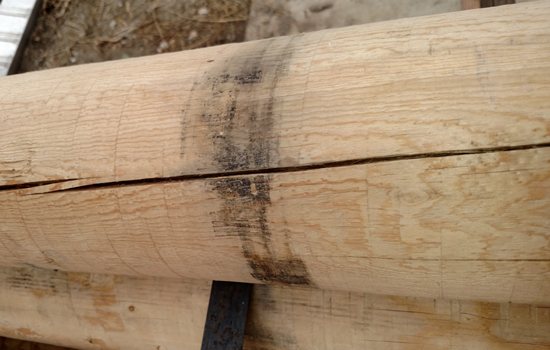 Information about our wood pine poles. We enjoy the rustic look of our wood and the character each piece can have & hope you will to. We want you to know exactly what you will be getting so we are sharing the following details. We store most or our wood outdoors and cover it but in many cased the wood comes to us somewhat weathered. The poles can have slight bows to them. During the drying process they tend to form what we call "checking" but basically what this is are cracks going from the outside of the wood towards the heart of the wood. This is normal and we have no way to prevent this from happening. Structurally the wood is still sound with these checks. We sell our wood as we receive it unless otherwise specified. No sanding or other finishing is done unless specified. There can be slight variations in the diameter sizes. Each piece of wood will be different and will have different characteristics such as amount of knots, size of knots, color of wood etc. The length of the wood will have variations so please let us know if you have a minimum size requirement. Some pieces will have more unique qualities than others. It should be expected that some pieces of wood will have areas where bark has not been completely removed, marks from the binding straps, mildew stains or other variations pictured below.