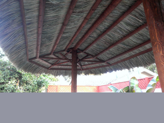 Our 6 inch diameter poles extend to 2 inch diameter pine rafters. The thatch roofing is hand woven Tahitian thatch.